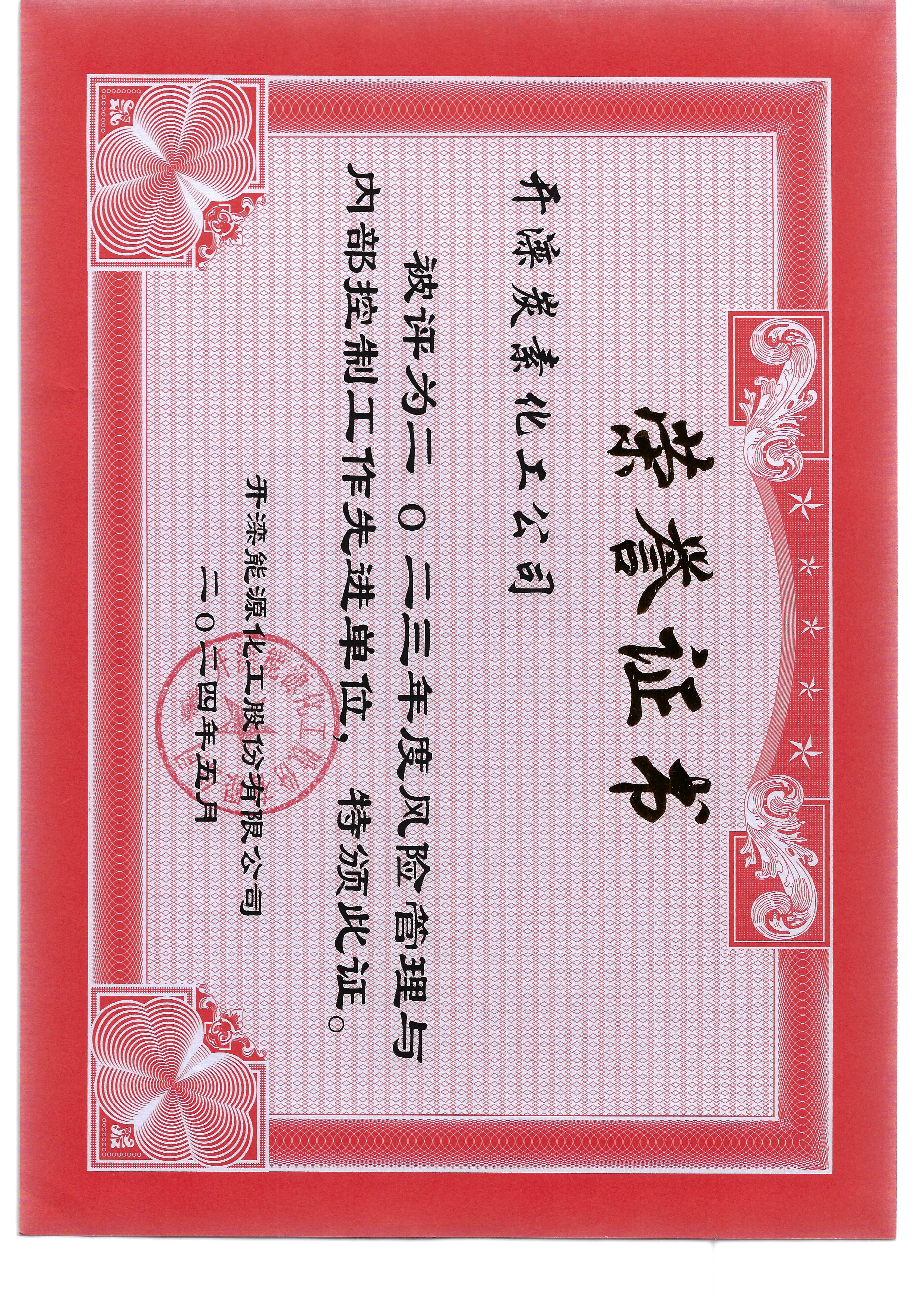我司被開灤能源化工股份有限公司授予2023年度風險管理與內(nèi)部控制工作先進單位